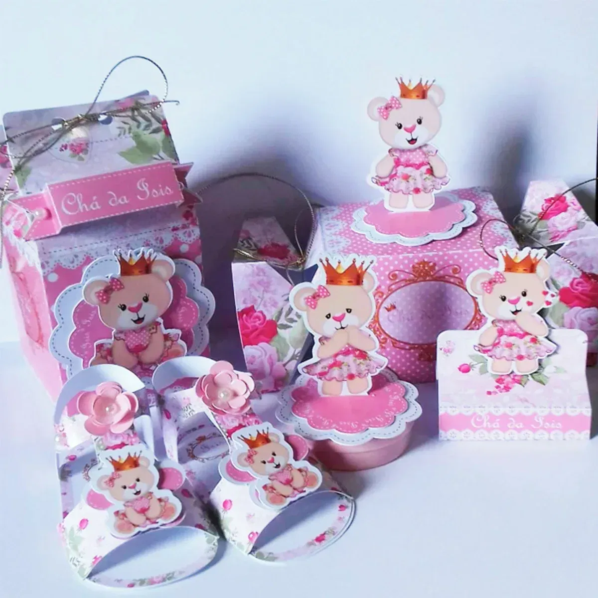 4. O kit inclui outros itens de festa personalizados? Este anúncio é específico para o molde do tema ursinha princesa. Porém, o design permite criar uma identidade visual completa para a sua decoração usando os elementos decorativos inclusos no arquivo.